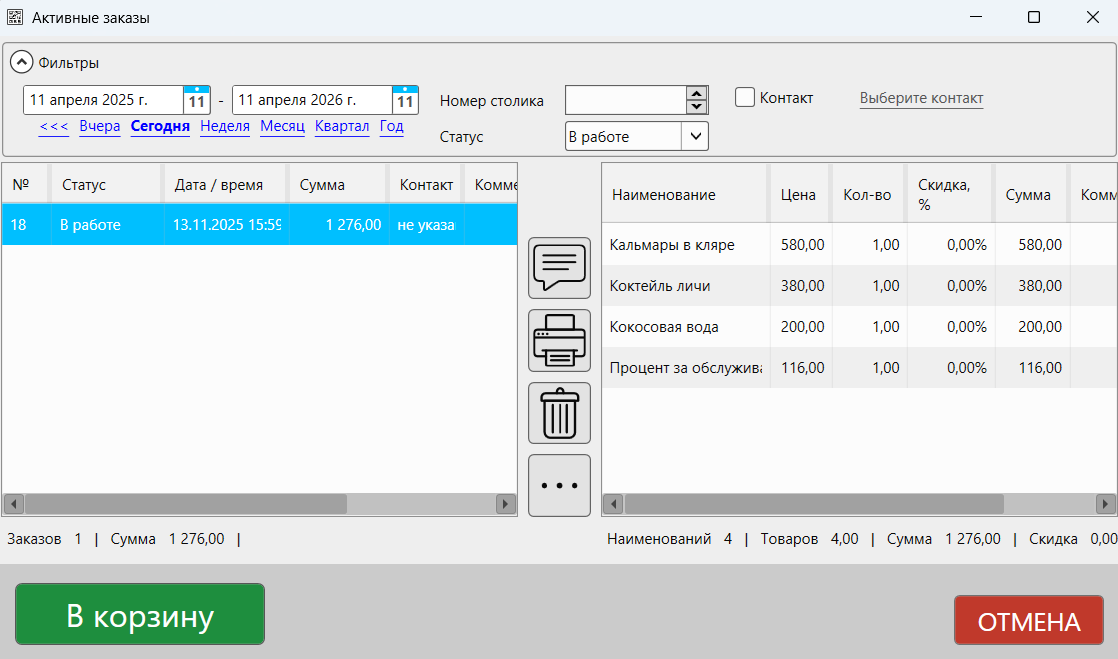 Внешний вид окна «Активные заказы» в режиме «Кафе»