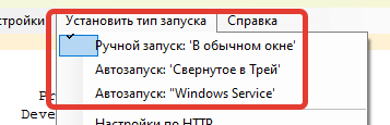 Выбрать режим запуска можно из окна программы в меню “Установить тип запуска”.