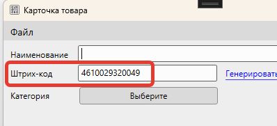 В карточке товара введите вручную или отсканируйте штрихкод с этикетки товара в соответствующее поле.
