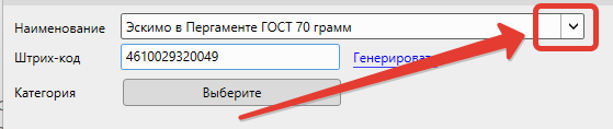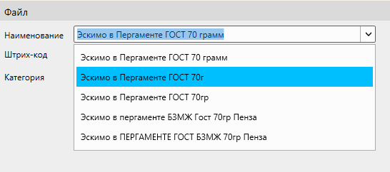 Если в базе будет найдено несколько совпадений для одного штрихкода, программа заполнит поле “наименование” самым популярным вариантом, а поле ввода названия приобретет вид выпадающего списка.